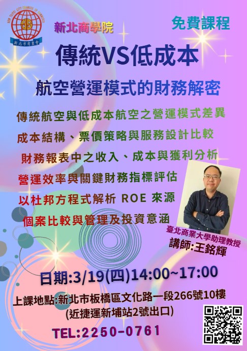 開課時間: 2026-03-19 ~ 2026-03-19 3/19(四)傳統VS低成本~航空營運模式的財務解密 課程內容 授課講師 臺北商業大學助理教授 講師:王銘輝 上課時間/地點 填寫線上報名表單 學員姓名 學員電話 公司(單位) 職 稱 電子信箱 驗證碼 清除重填 確認送出 回上一頁