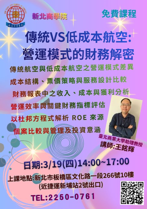 開課時間: 2026-03-19 ~ 2026-03-19 3/19(四)傳統VS低成本航空:營運模式的財務解密 課程內容 授課講師 臺北商業大學助理教授 講師:王銘輝 上課時間/地點 填寫線上報名表單 學員姓名 學員電話 公司(單位) 職 稱 電子信箱 驗證碼 清除重填 確認送出 回上一頁