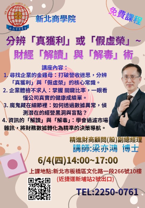 開課時間: 2026-06-04 ~ 6/4(四)分辨「真獲利」或「假虛榮」--財經「解讀」與「解毒」術 課程內容 授課講師 精進財商顧問(股)副總經理 講師:梁亦鴻 上課時間/地點 填寫線上報名表單 學員姓名 學員電話 公司(單位) 職 稱 電子信箱 驗證碼 清除重填 確認送出 回上一頁
