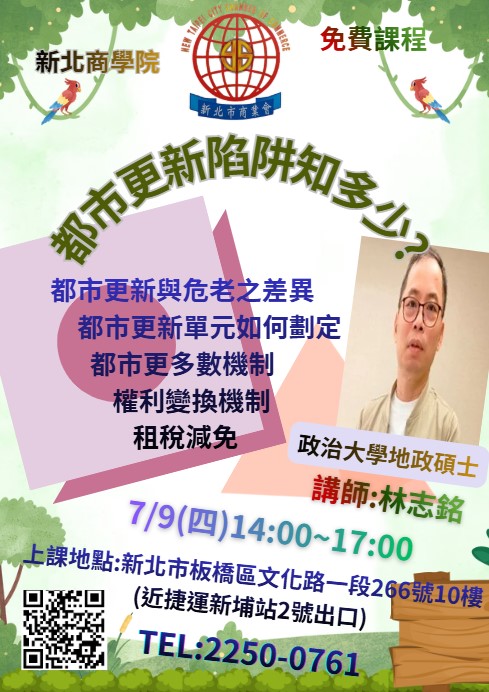 開課時間: 2026-07-09 ~ 7/9(四)都市更新陷阱知多少? 課程內容 授課講師 國立政治大學地政碩士 國立政治大學法律碩士 國立臺北商業大學講師 講師:林志銘 上課時間/地點 填寫線上報名表單 學員姓名 學員電話 公司(單位) 職 稱 電子信箱 驗證碼 清除重填 確認送出 回上一頁