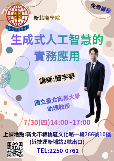 開課時間: 2026-07-30 ~ 2026-07-30 7/30(四)生成式人工智慧的實務運用 課程內容 授課講師 講師:簡宇泰老師 現職:國立臺北商業大學助理教授 上課時間/地點 填寫線上報名表單 學員姓名 學員電話 公司(單位) 職 稱 電子信箱 驗證碼 清除重填 確認送出 回上一頁