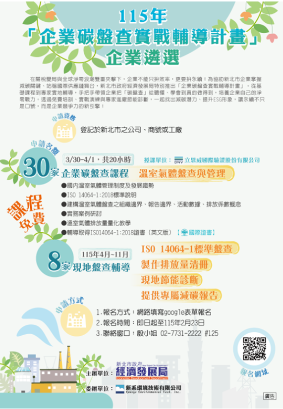 「115年度新北市企業碳盤查實戰輔導計畫」遴選公告,報名時間即日起至115年2月23日