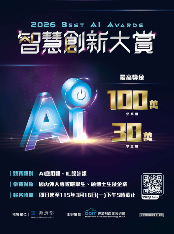 【轉知】經濟部商業發展署-第2屆「智慧創新大賞」,報名時間即日起至115年3月16日下午5點止,敬請踴躍報名參加